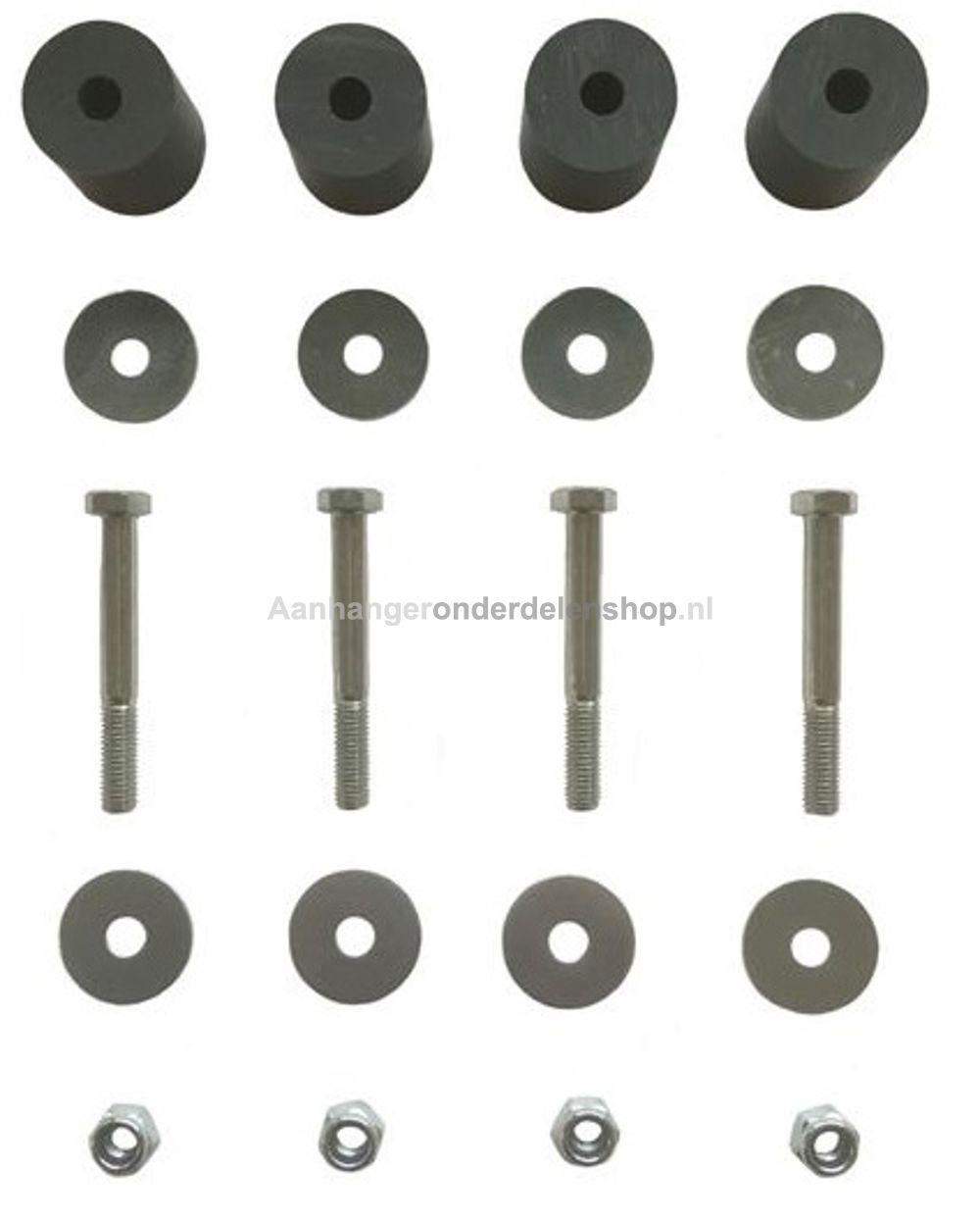 Inhoud Set 4 x Kunststof Bus Ø30 x 25MM, 4 x Bout M8x65, 8 x Carroseriering M8, 4 x Borgmoer M8