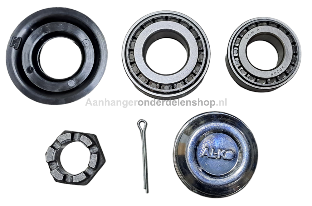 1 x kegellager 30205, 1 x kegellager 32007X, 1 x keerring, 1 x kroonmoer, 1 x splitpen, 1 x naafdop