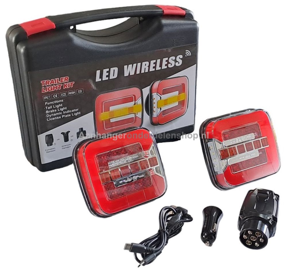Achterlamp magneet links, achterlamp magneet rechts, 7 polige signaal stekker, USB laadkabel, lader sigarettenaansteker, opbergkoffer.