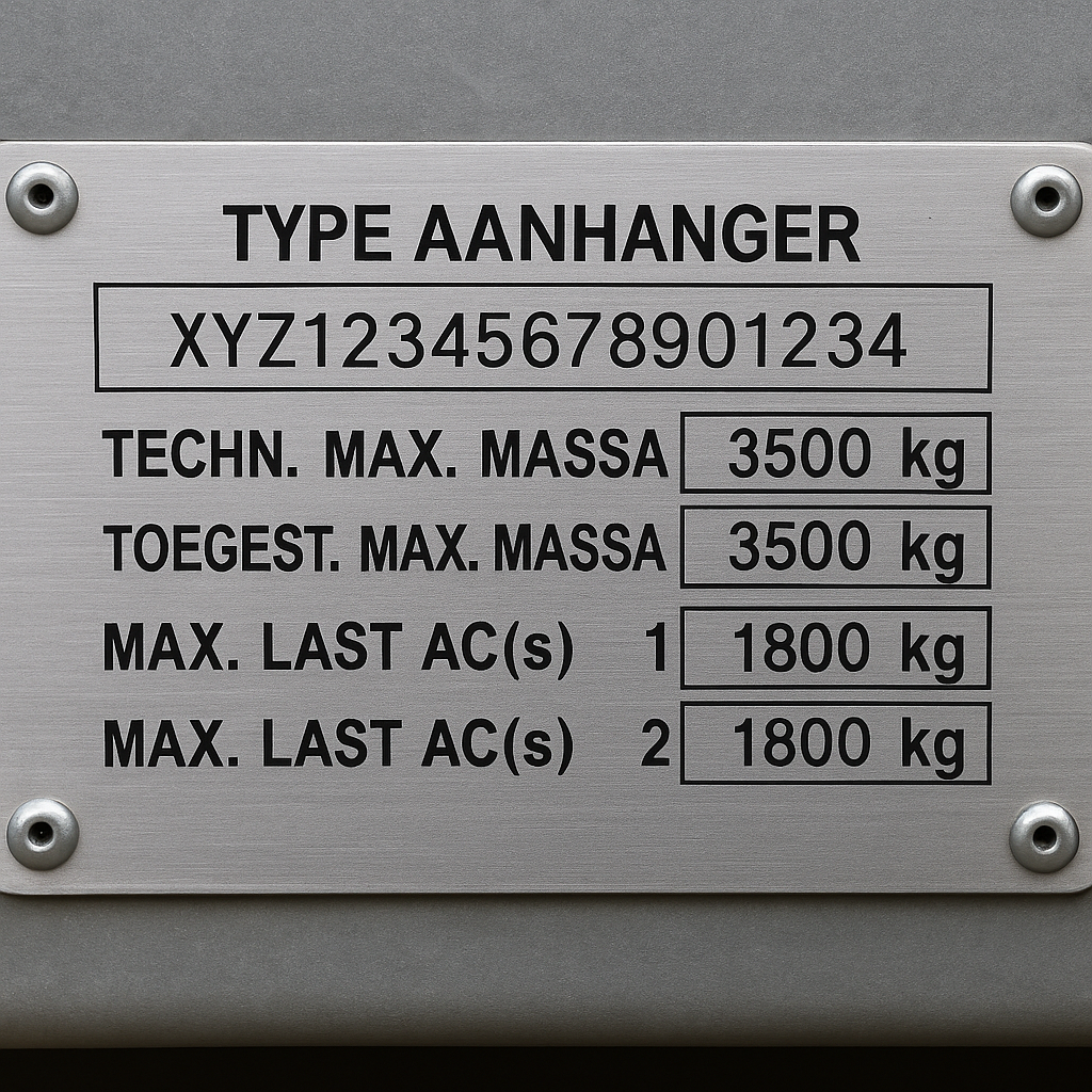 Op een typeplaatje vindt u gegevens zoals het chassisnummer, het merk en type, het bouwjaar, de maximale aslast(en) en het toegestane totaalgewicht (MTM). Ook kan er informatie vermeld staan over de koppeling en technische specificaties van de aanhanger. Deze gegevens zijn van belang bij de registratie, het beladen en het onderhoud van uw aanhanger.